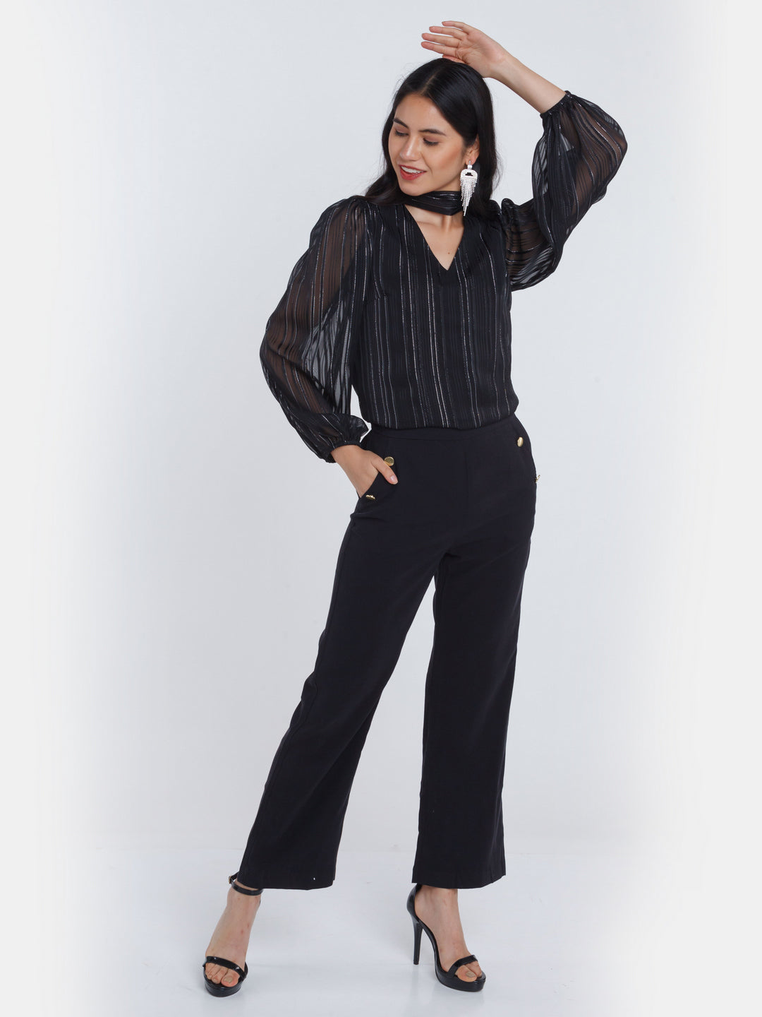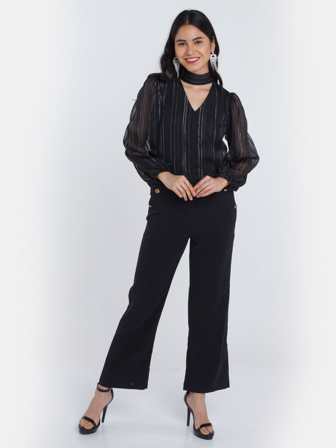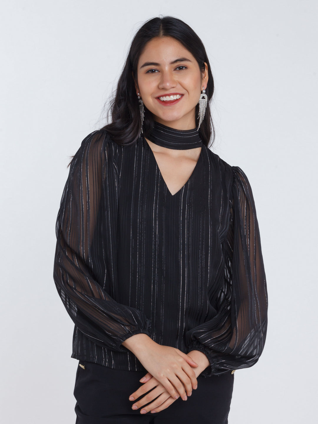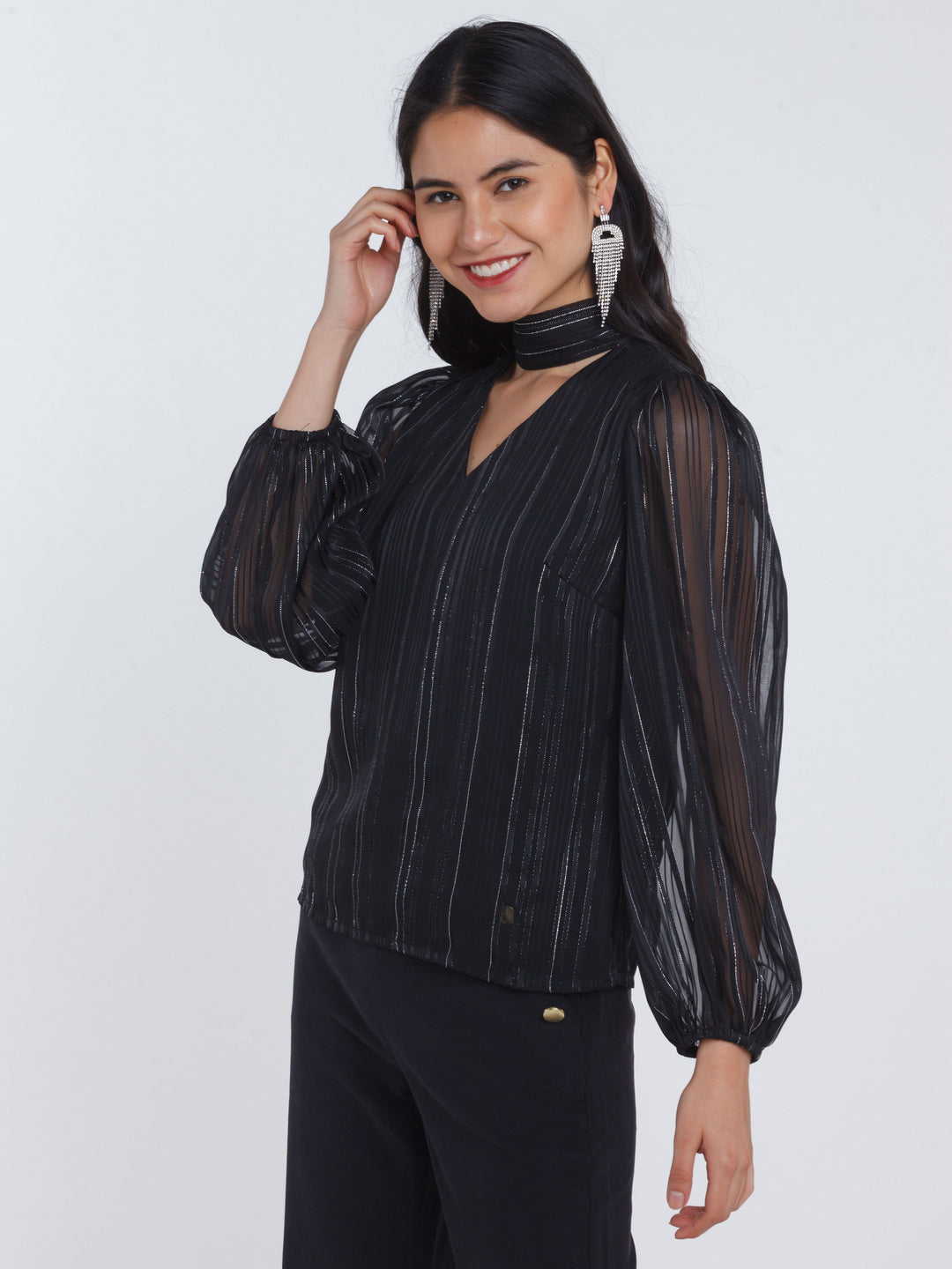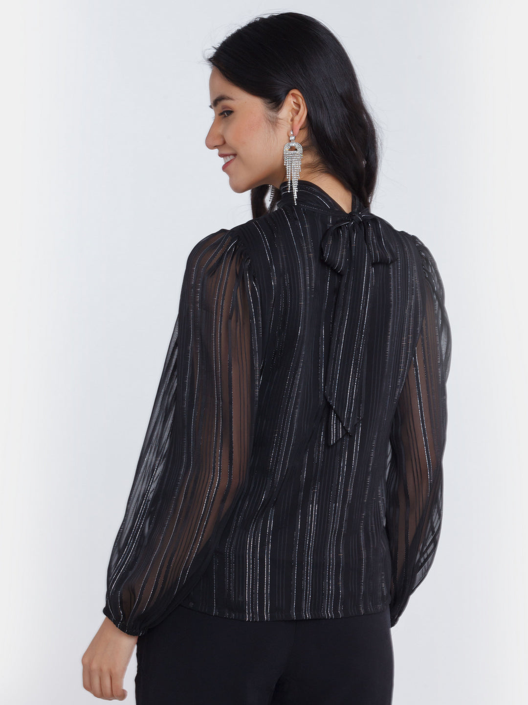 - Description : Black Striped Tie-Up Top For Women