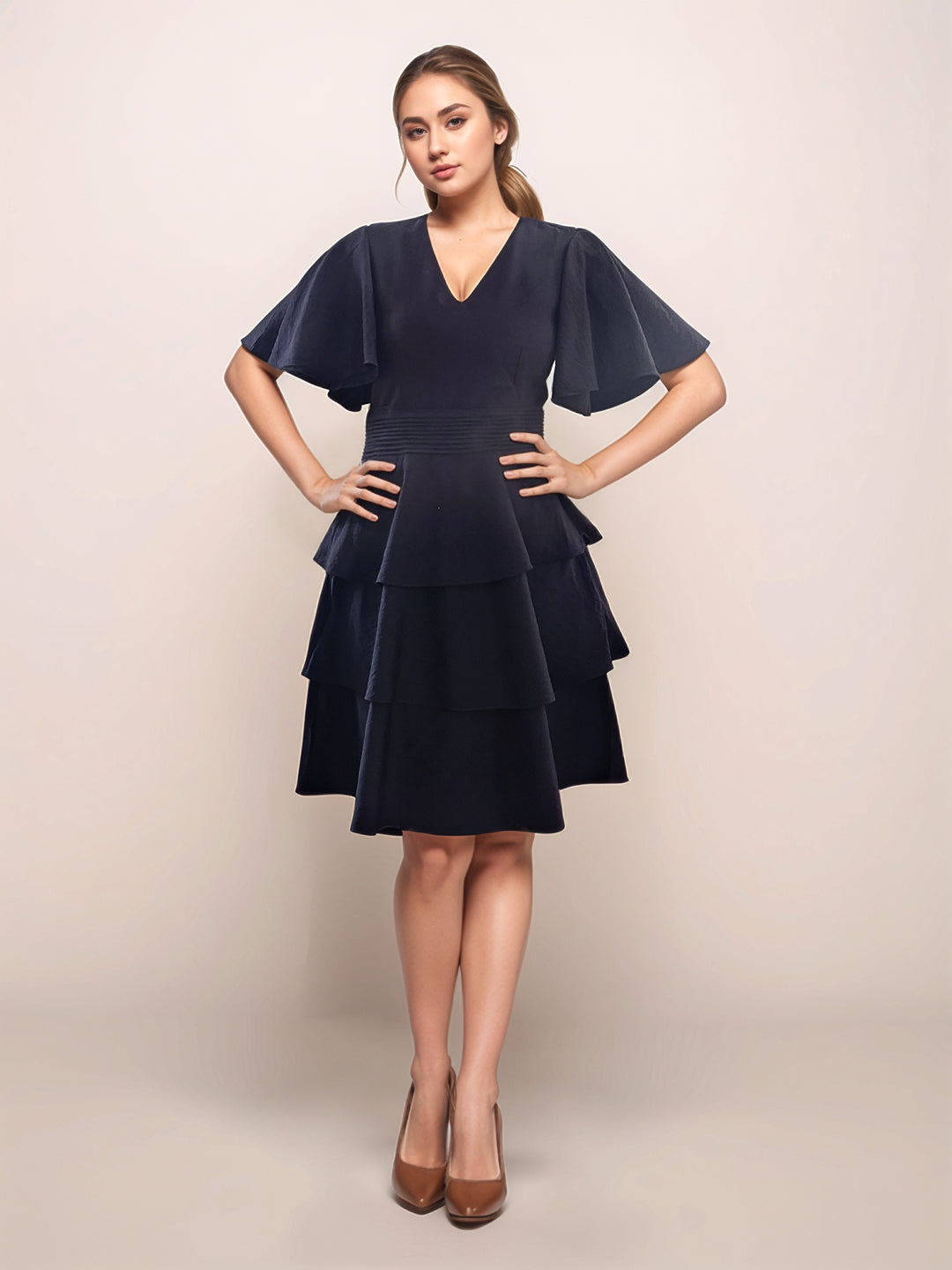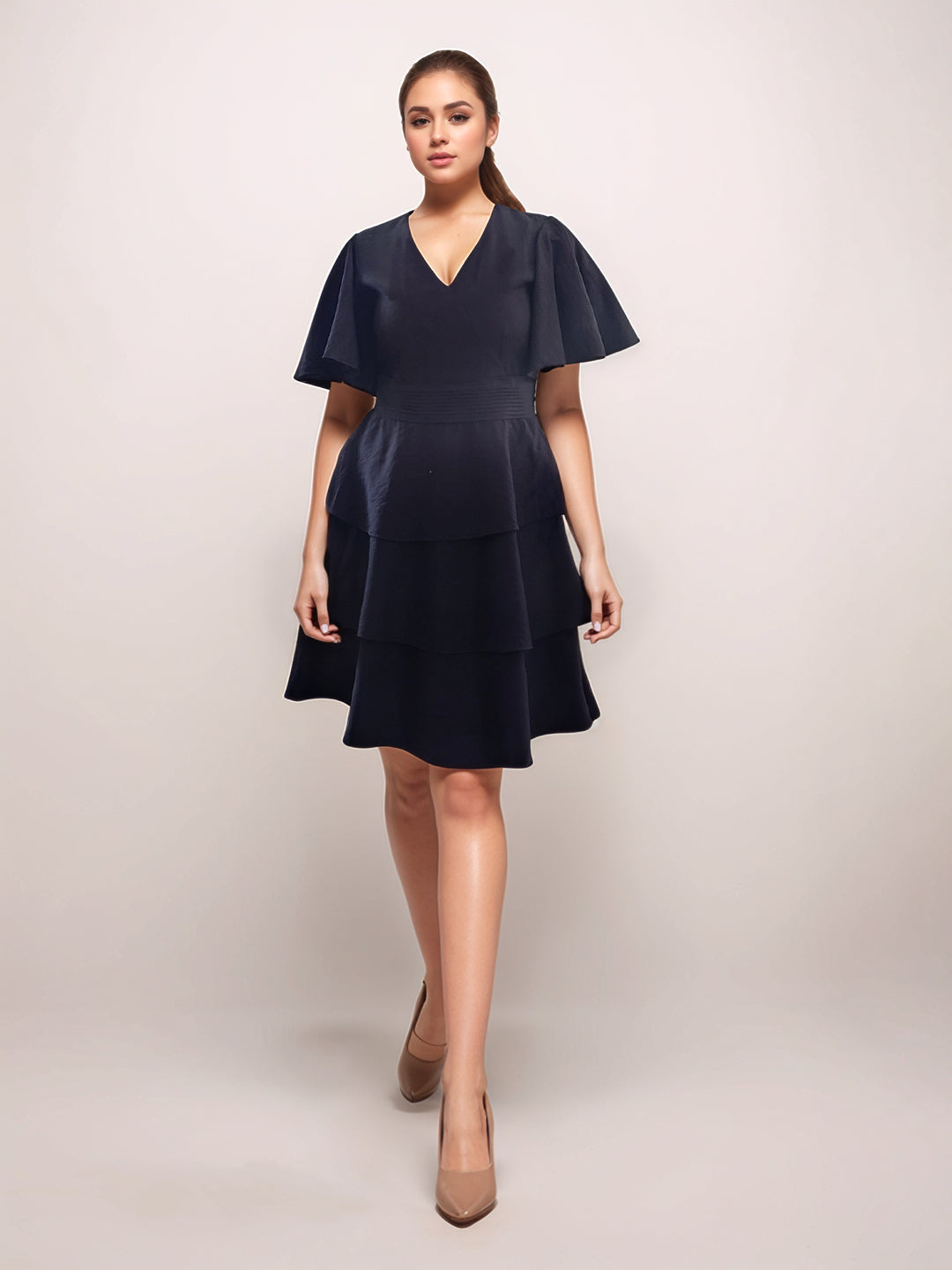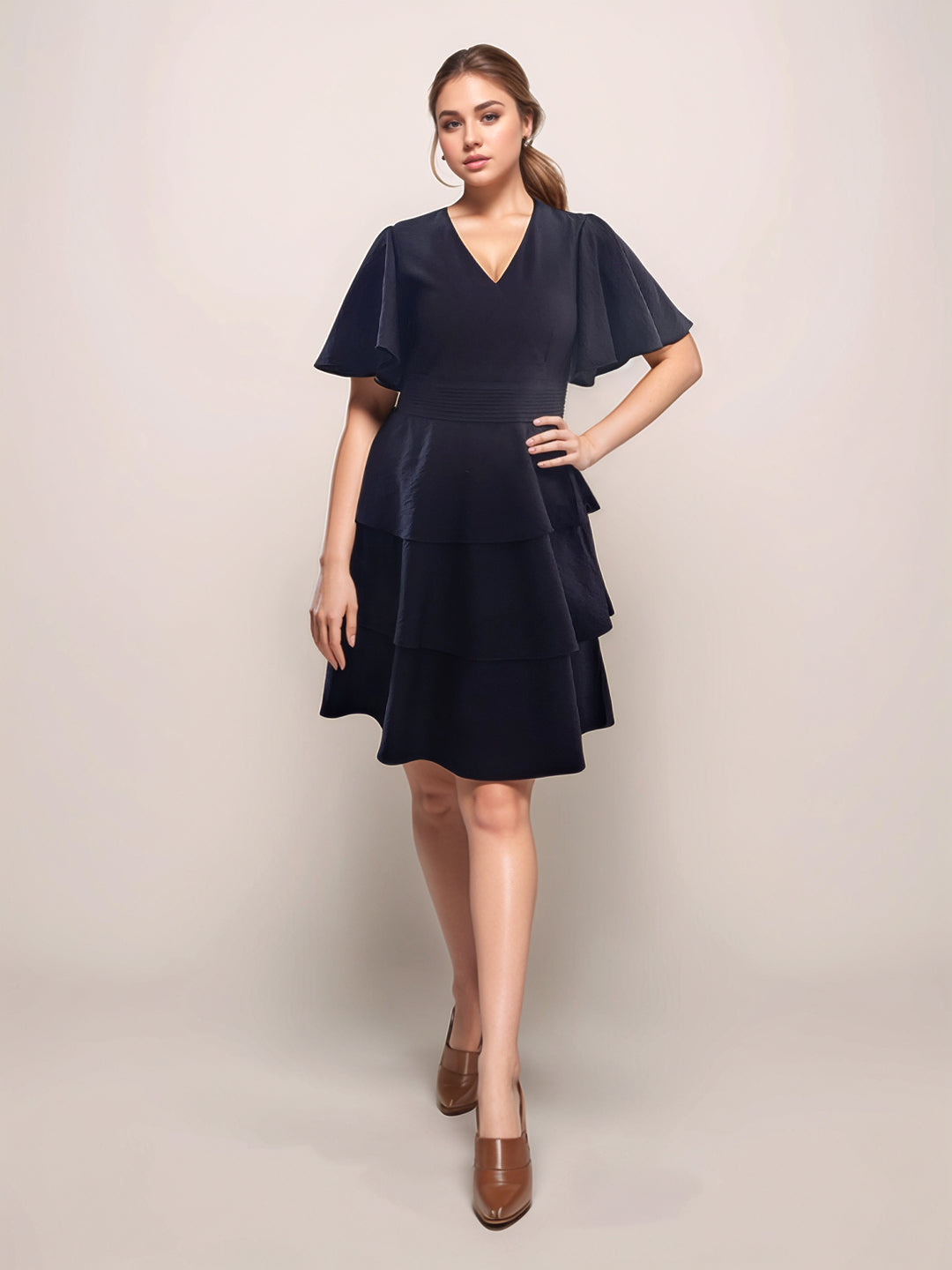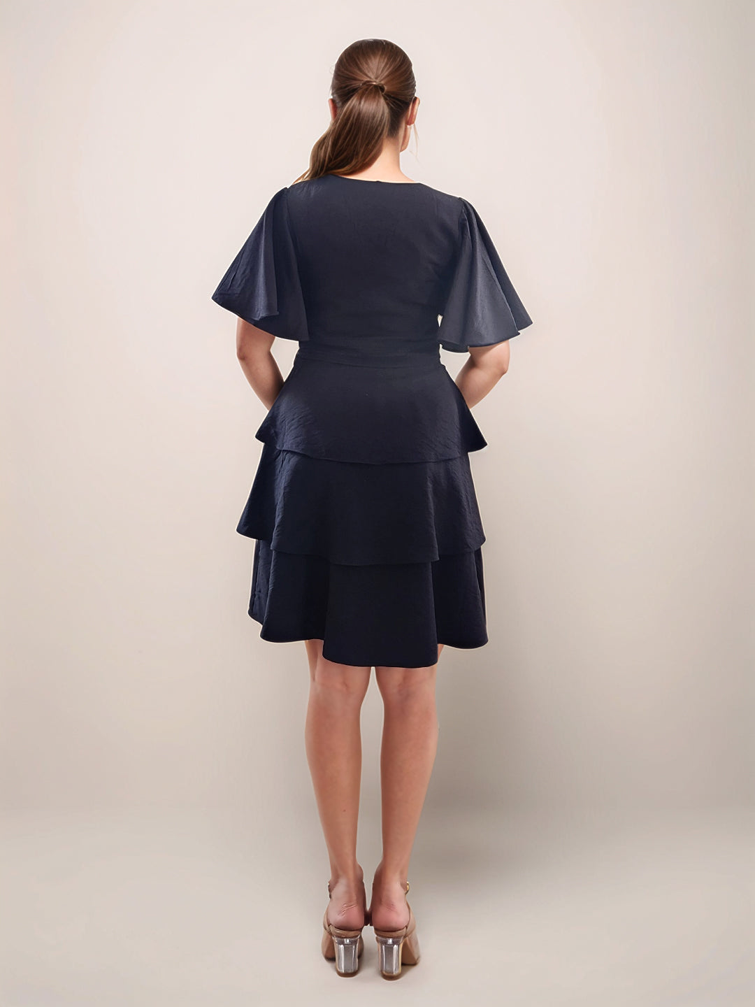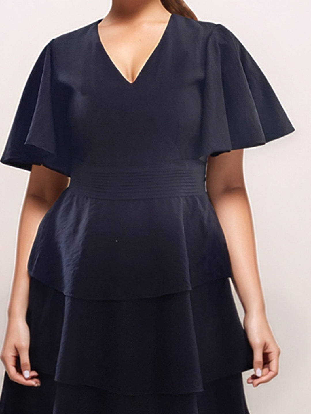 Black Solid V-Neck SHORT SLEEVES Short Dress