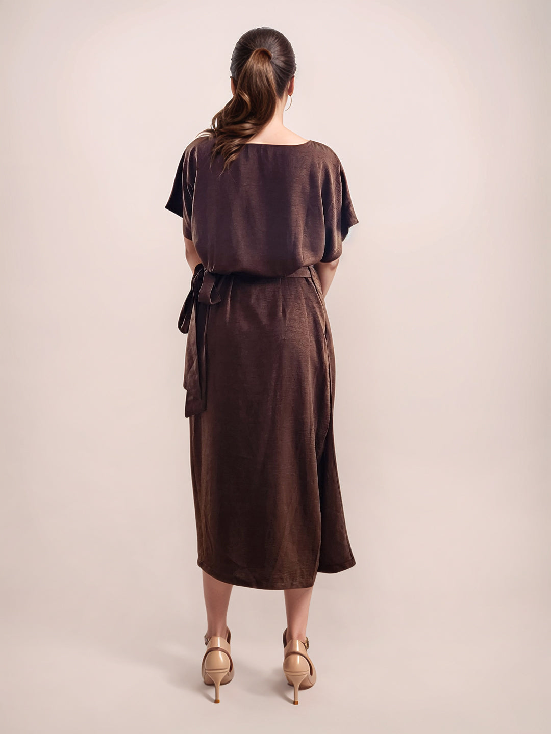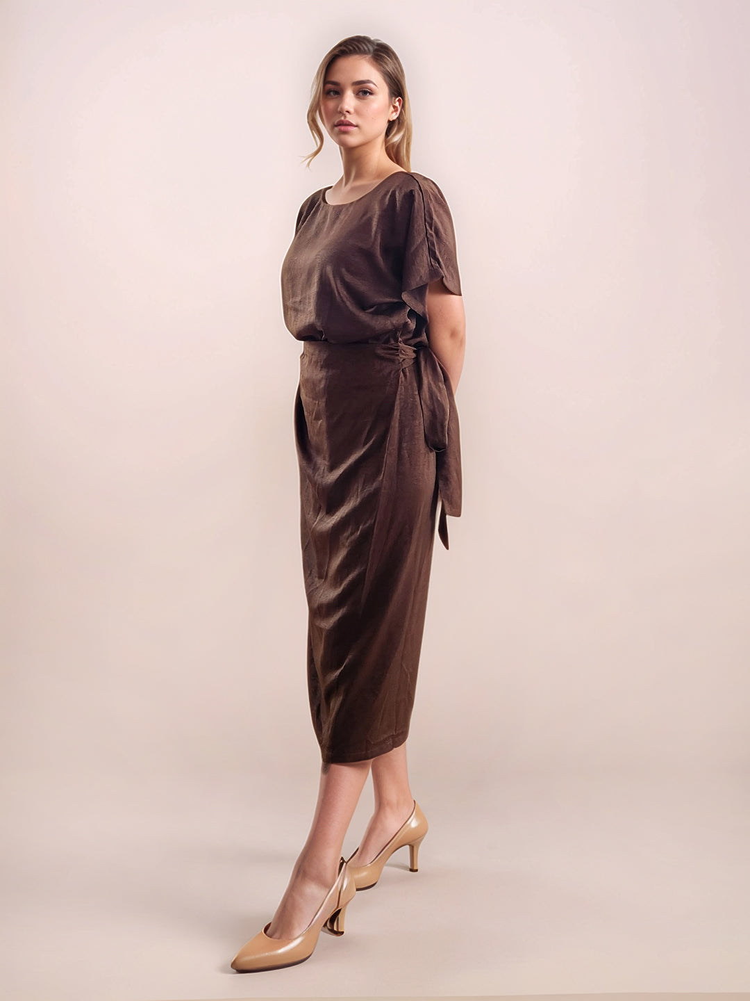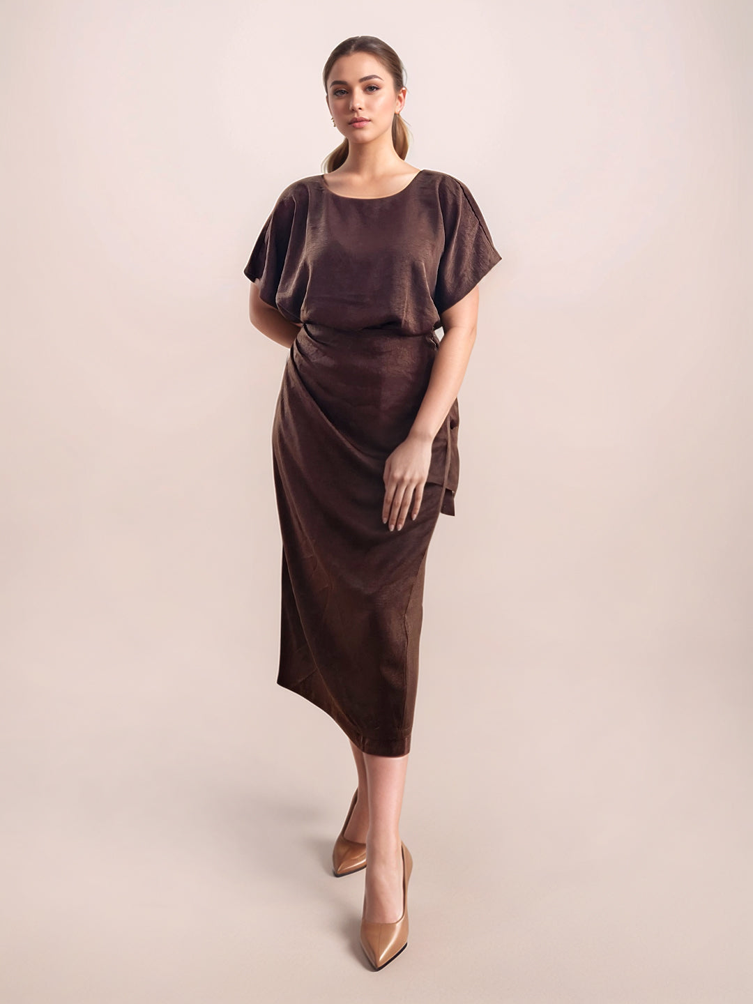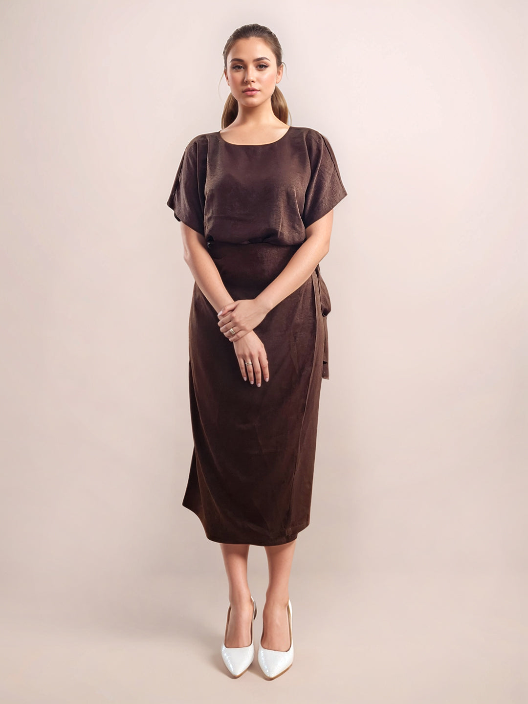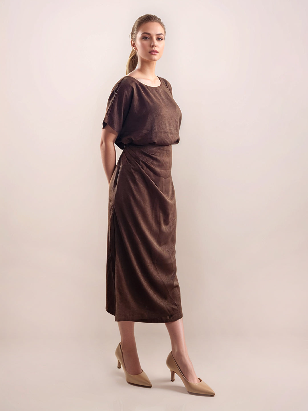 Dark Brown Self Design Round Neck SHORT SLEEVES Maxi