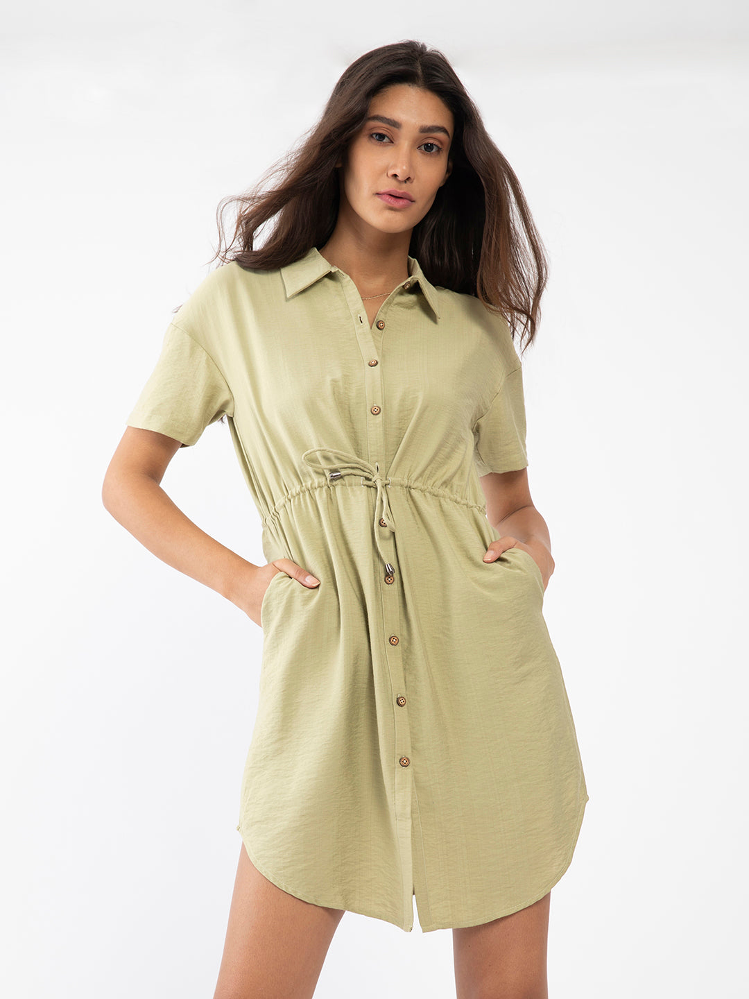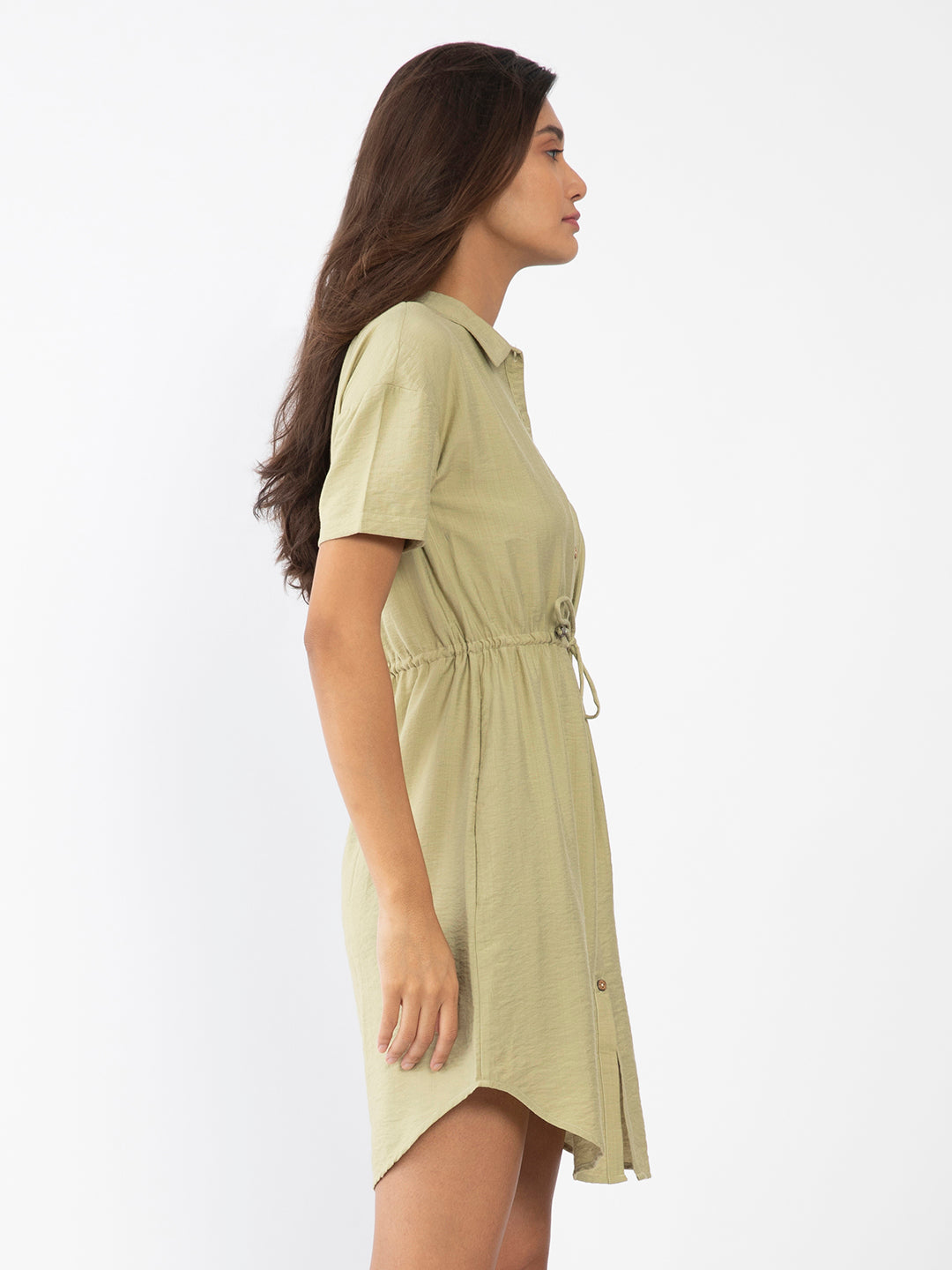 - Description : Green Solid Shirt Dress For Women