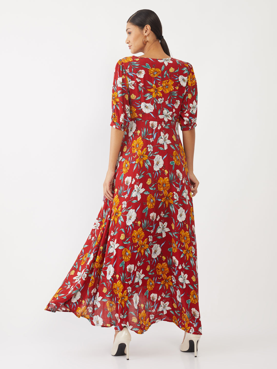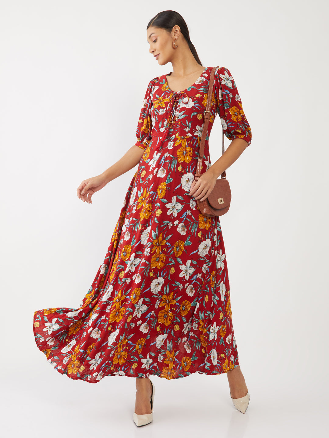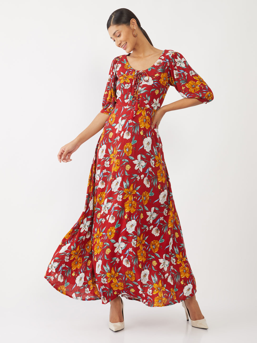 - Description : Maroon Floral Print Maxi For Women