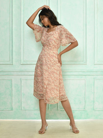Multi-Colored Tropical Print Short Sleeves Knee-Length Dress