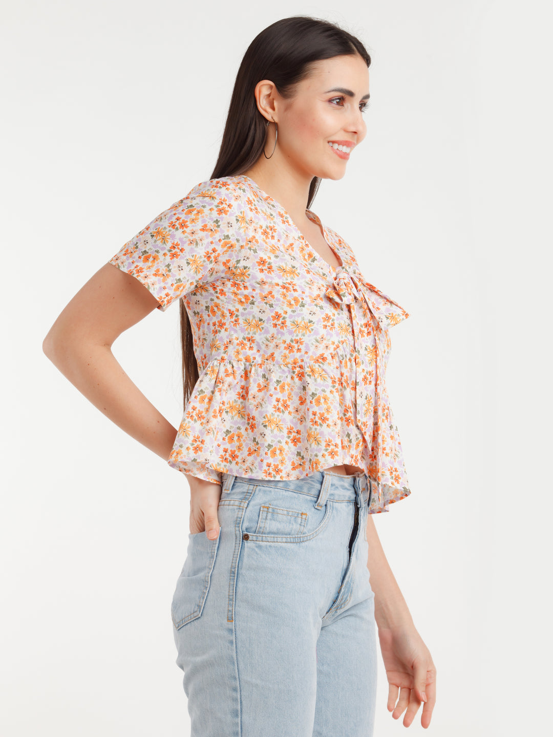 Black & Baby Pink Floral Print Ruffled Sleeves Top