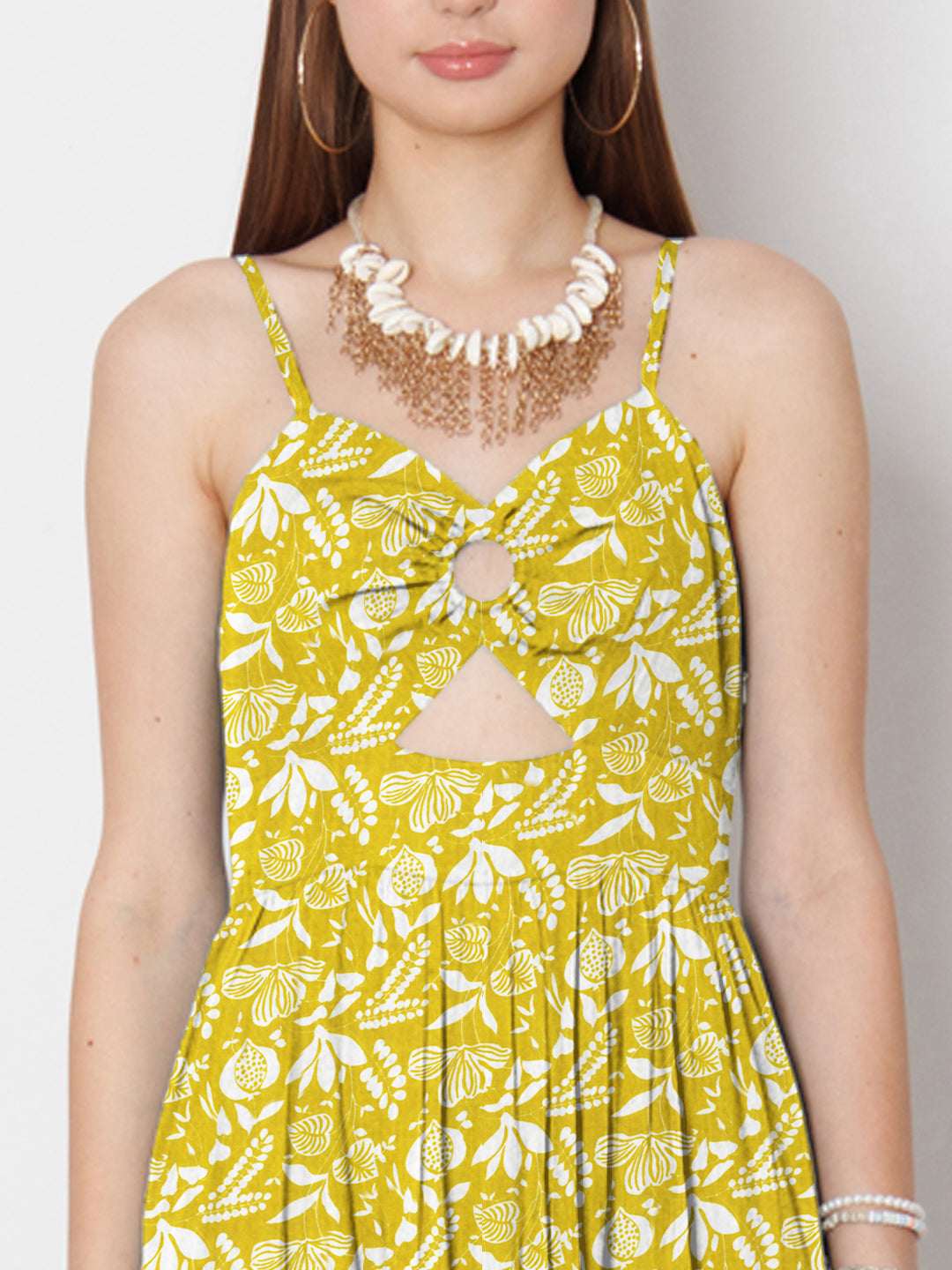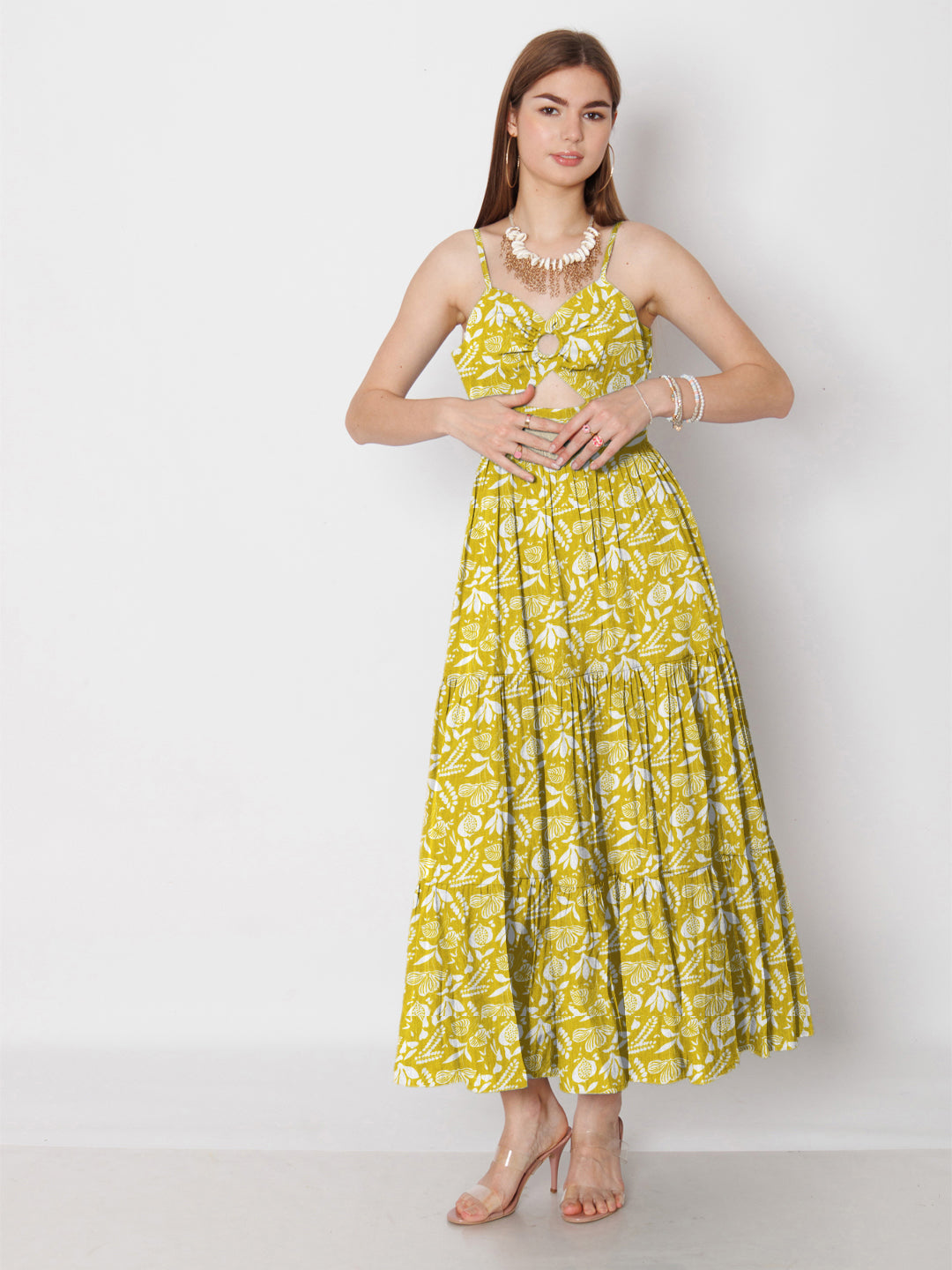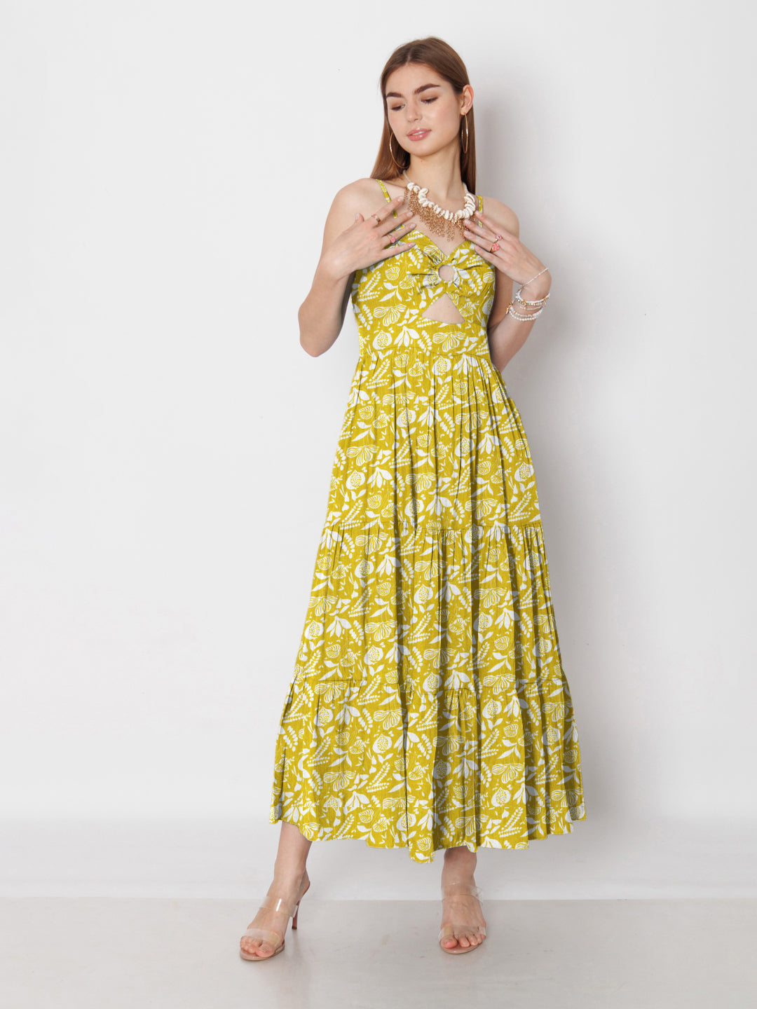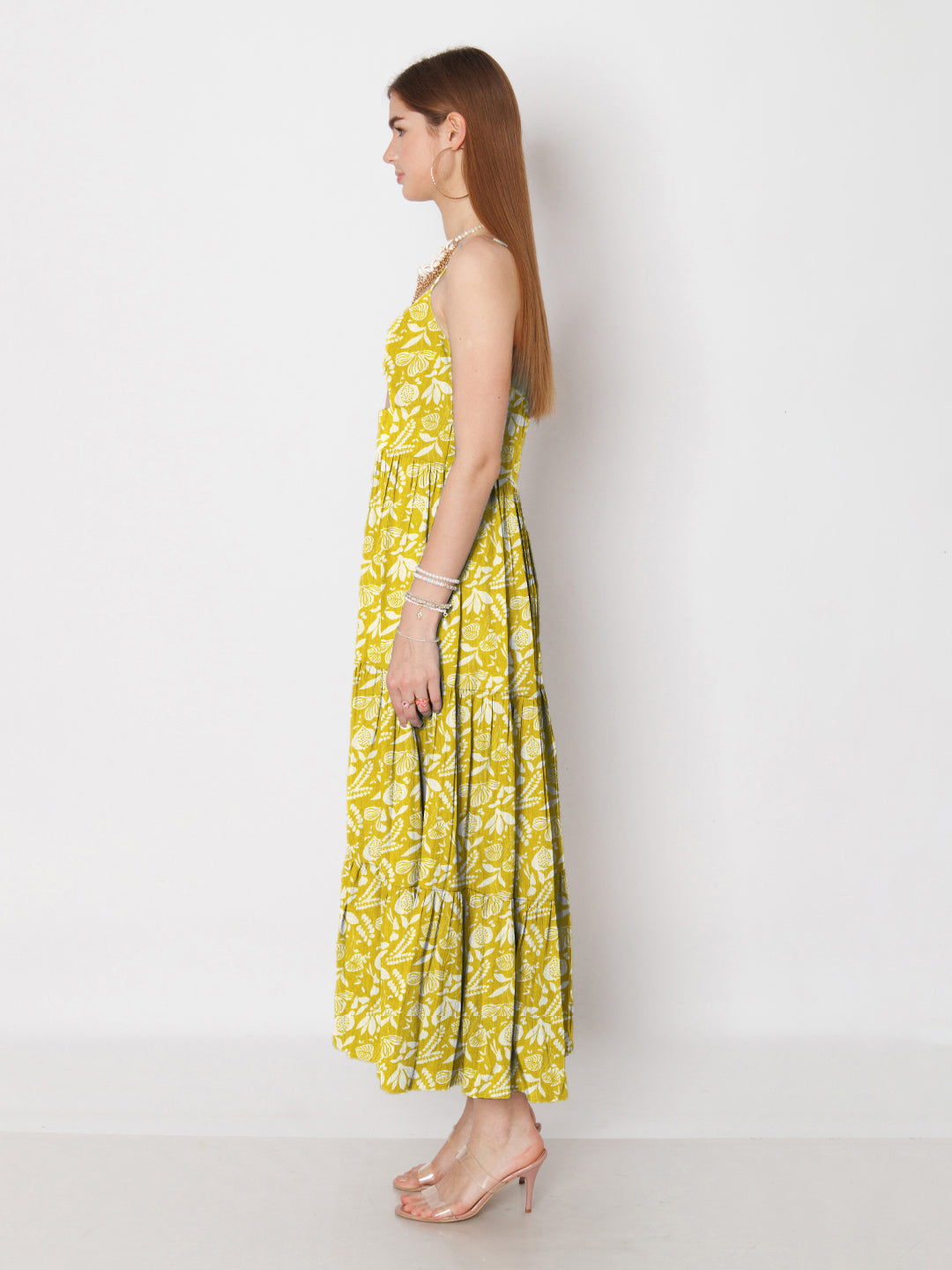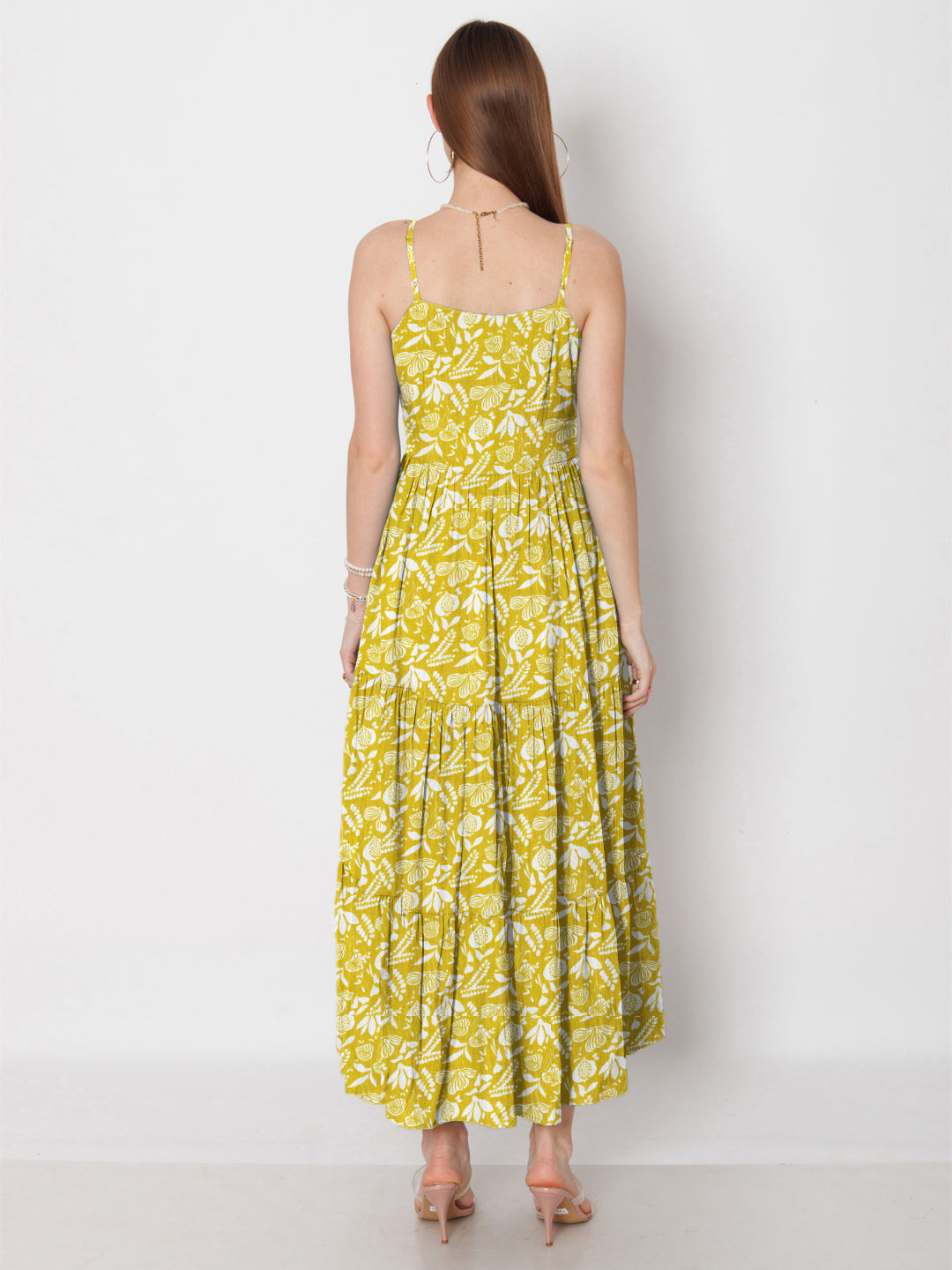 Ochre Yellow Floral Printed Fit & Flare Maxi Dress