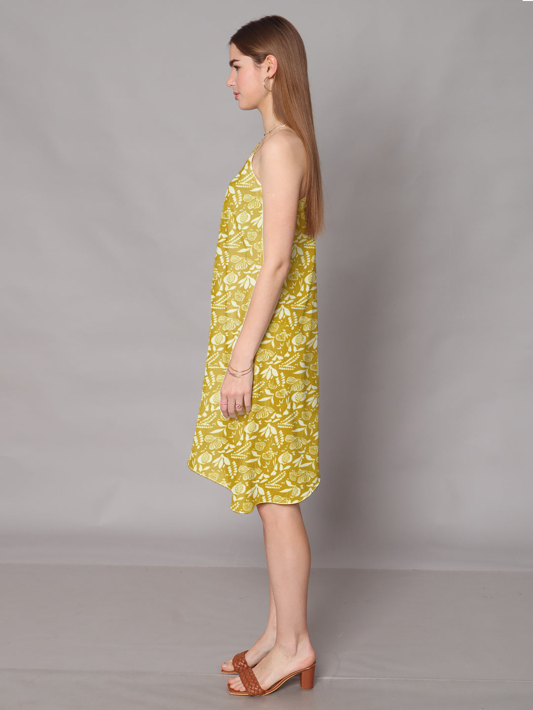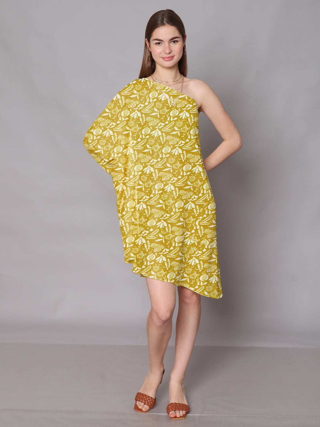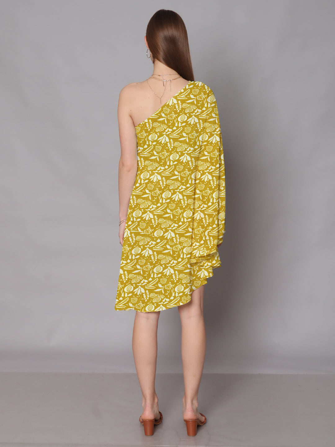 Ochre Yellow Floral Printed One Shoulder Knee Length Dress