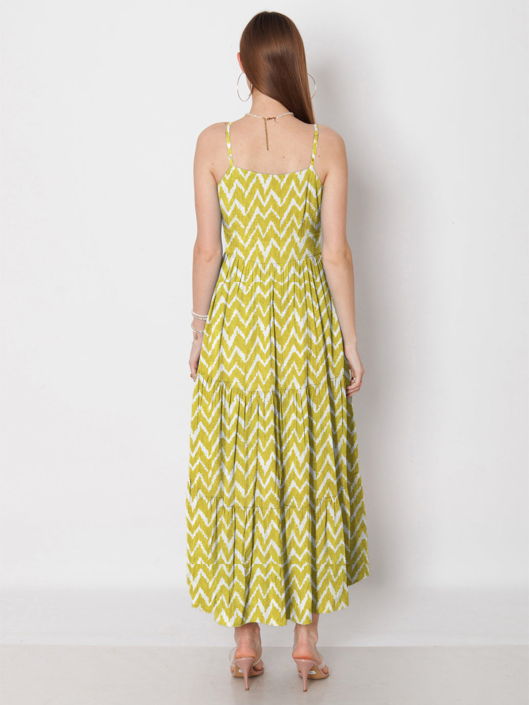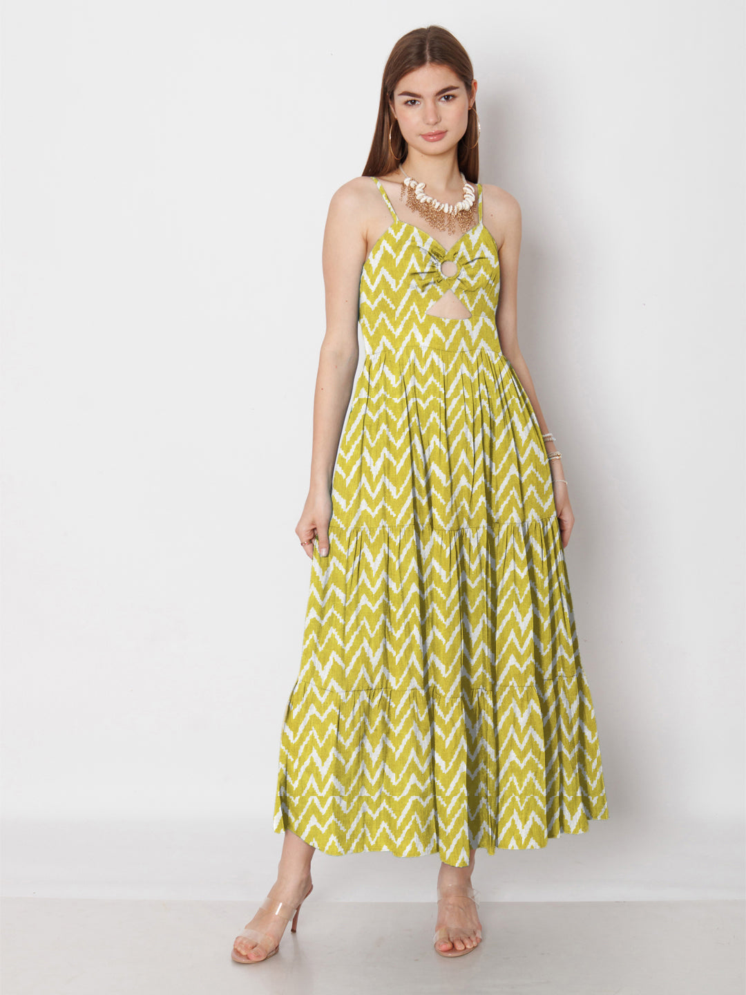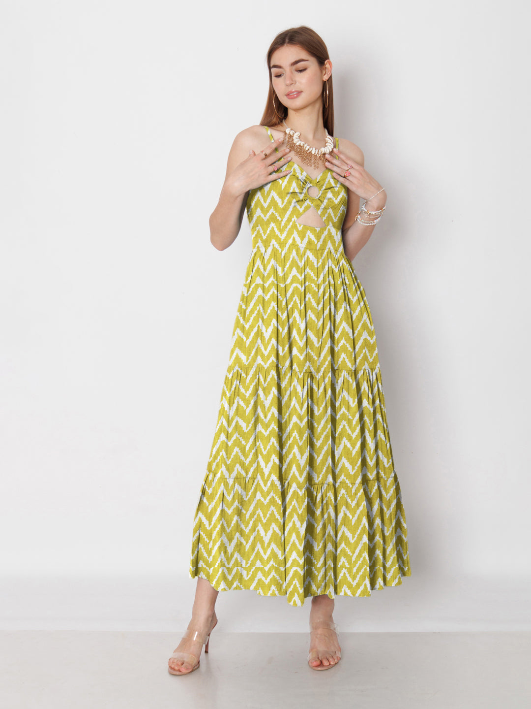 Olive Green Geometric Printed Fit & Flare Maxi Dress