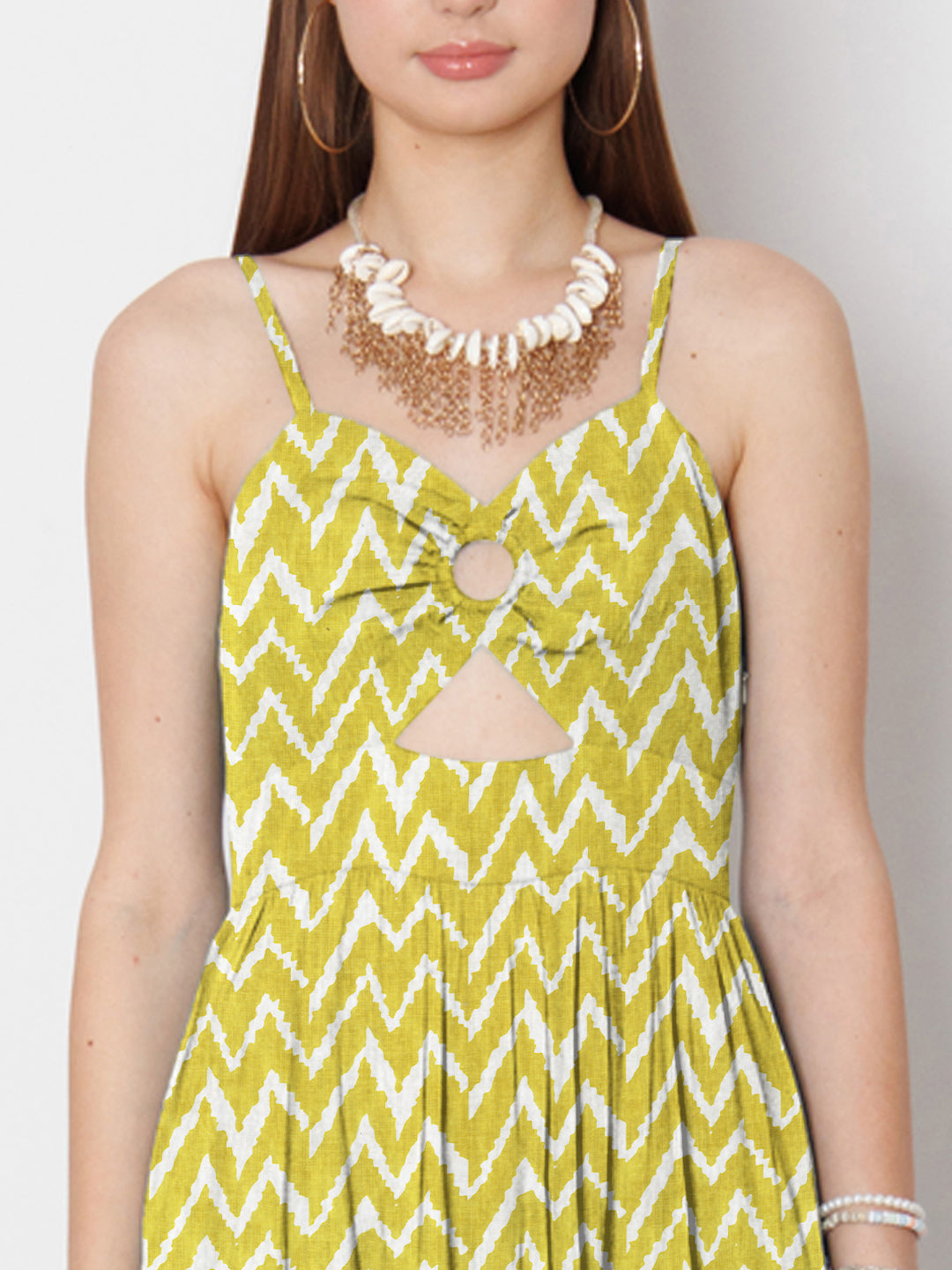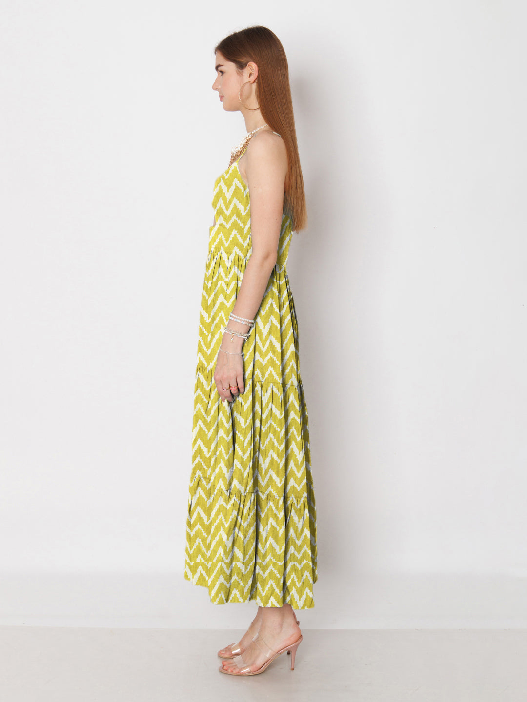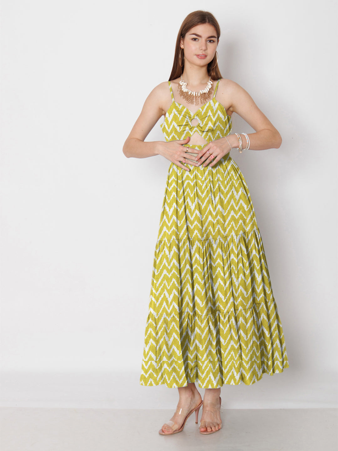 Olive Green Geometric Printed Fit & Flare Maxi Dress