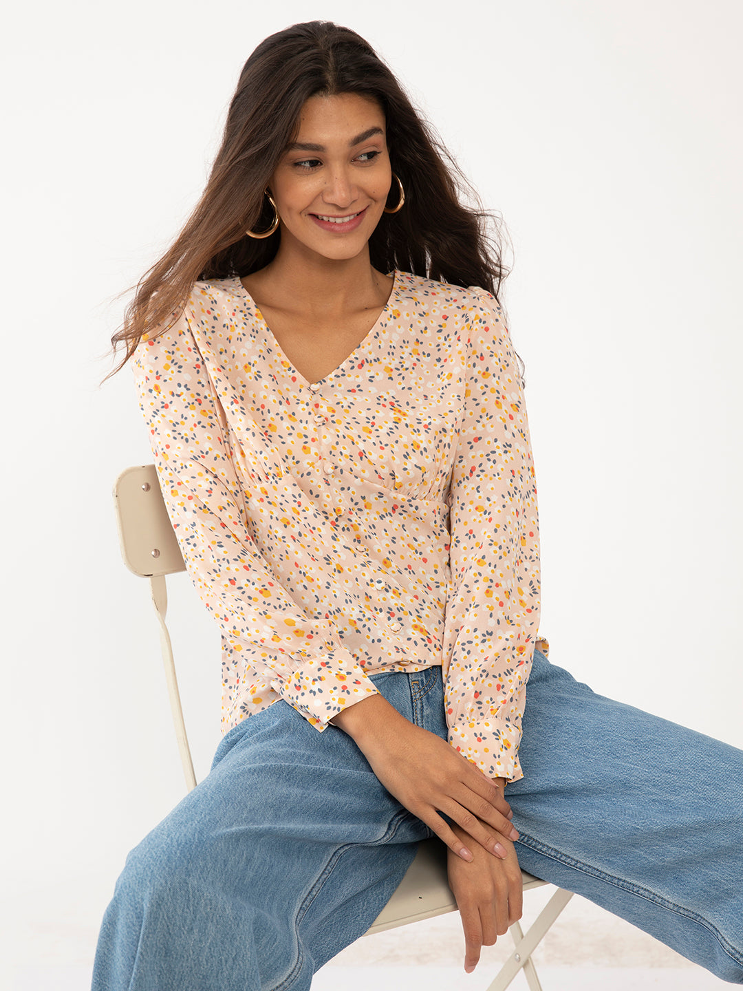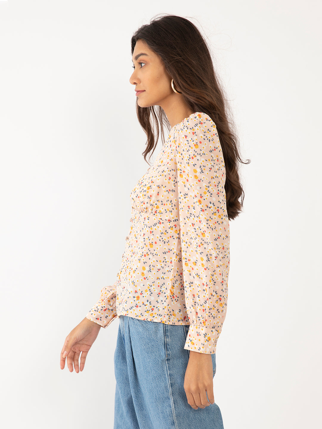Black & Baby Pink Floral Print Ruffled Sleeves Top
