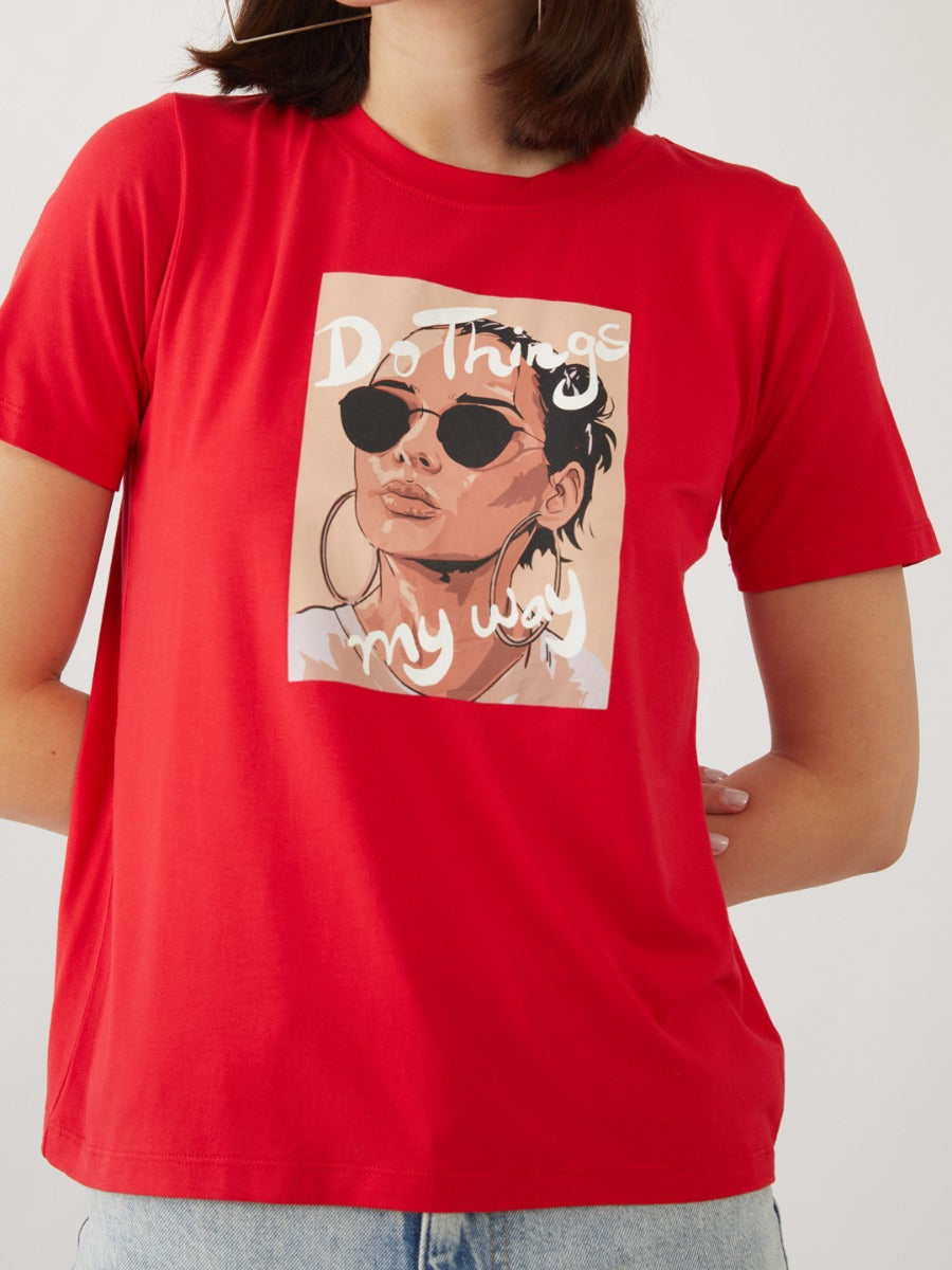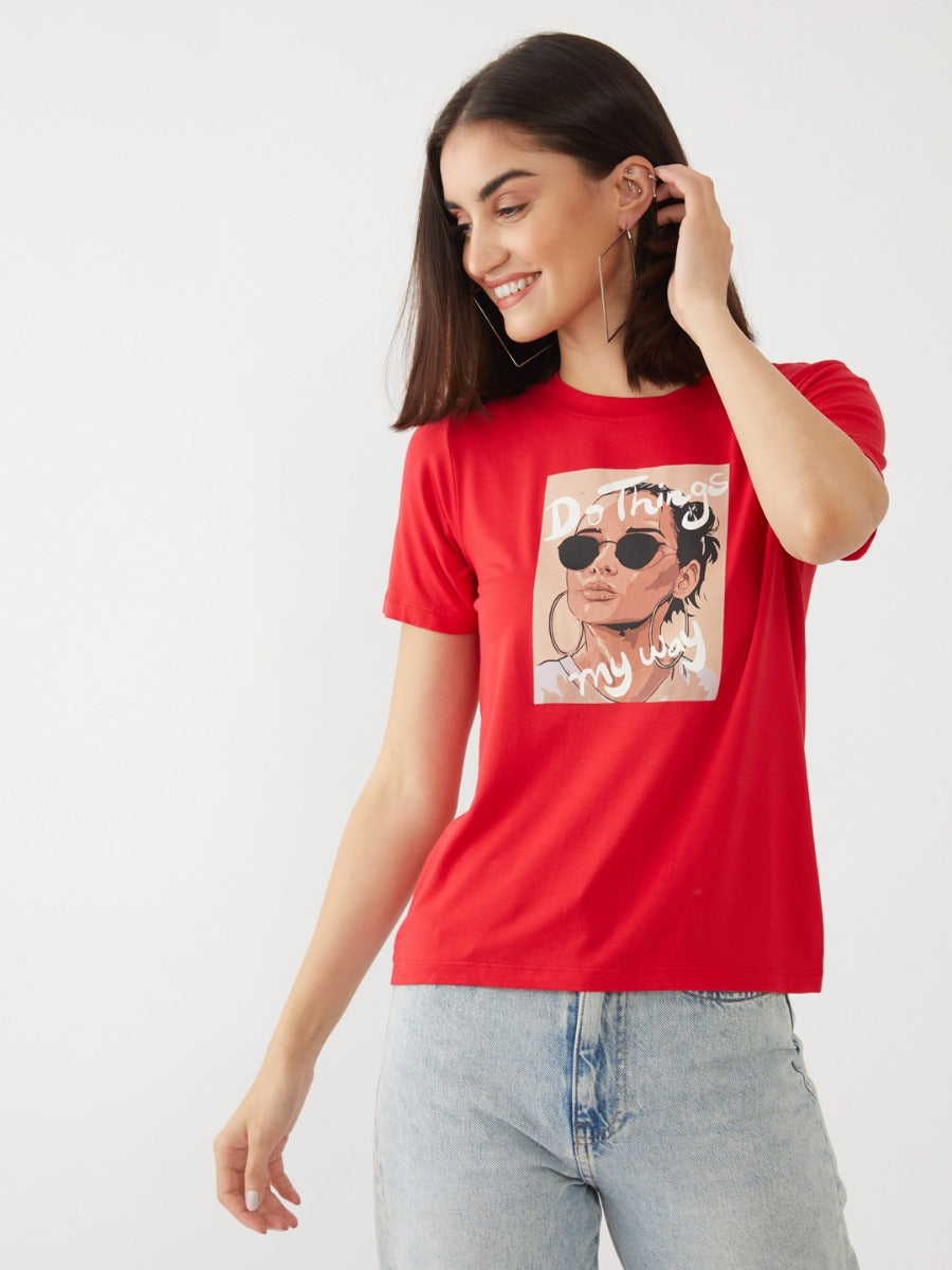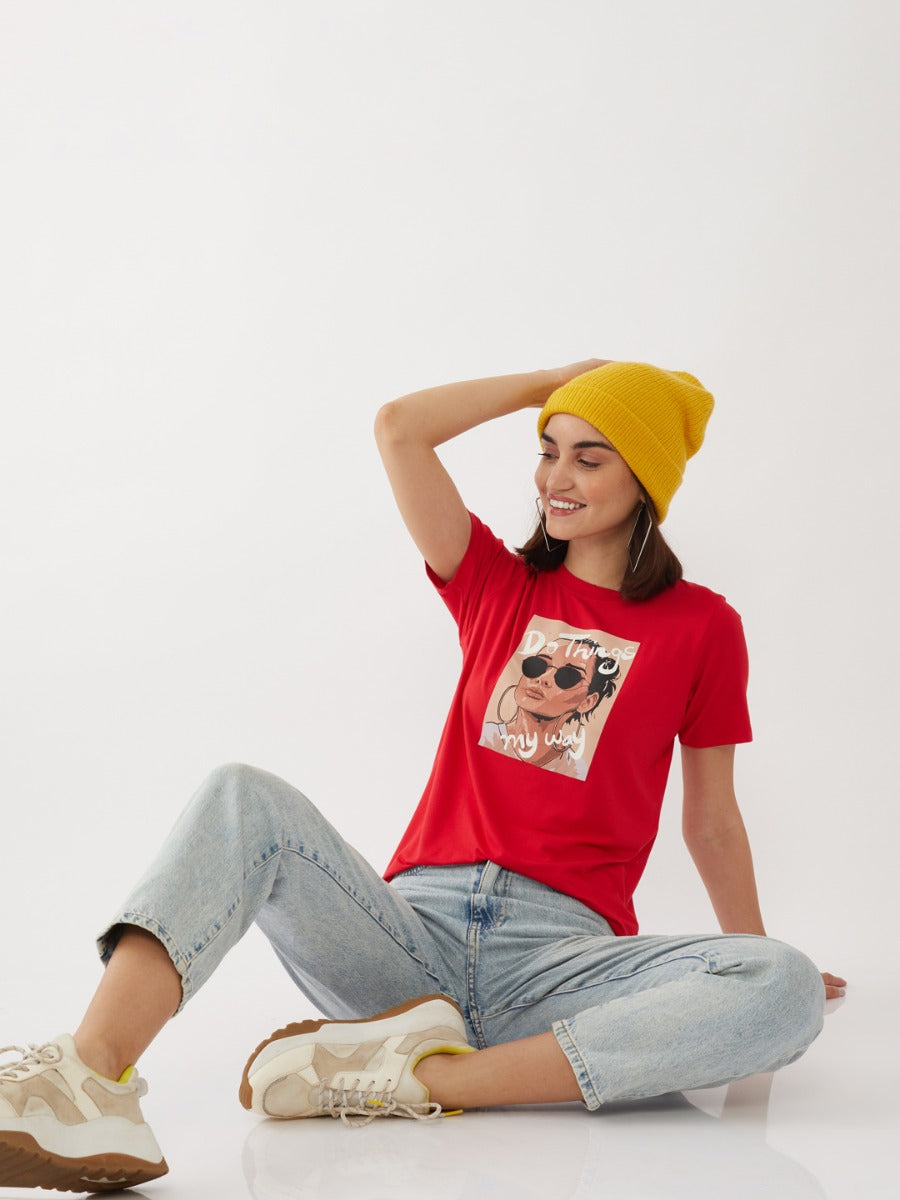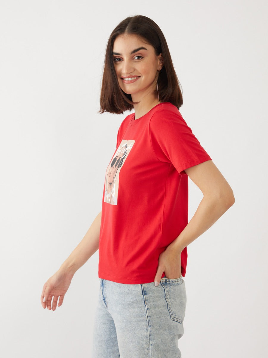 - Description : Red Graphic Print T-Shirt For Women