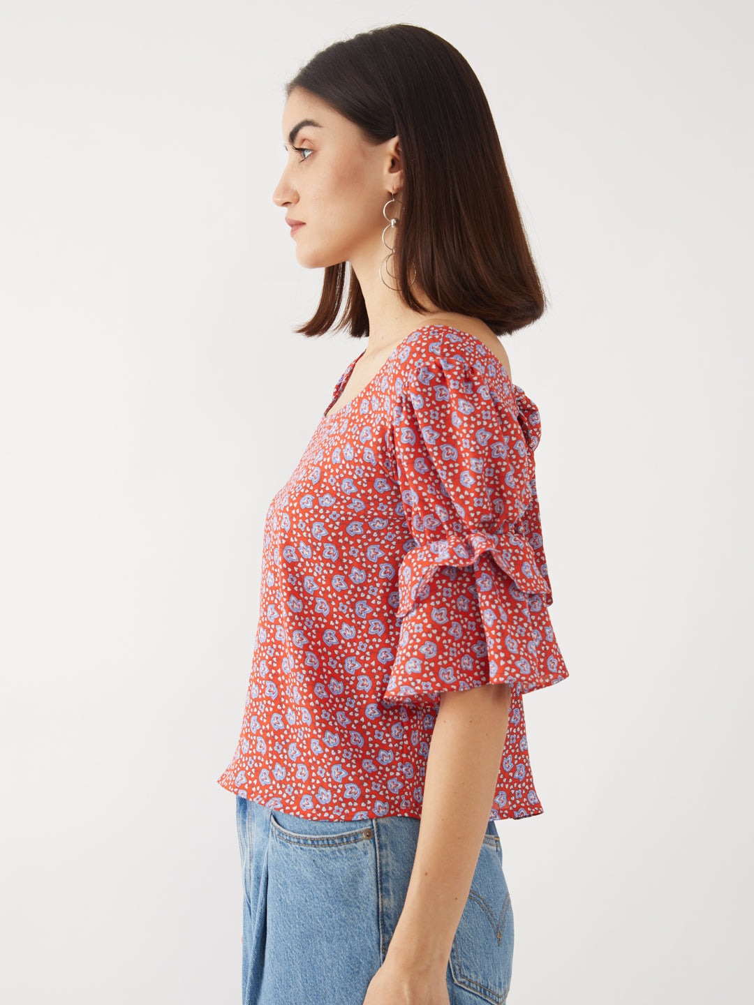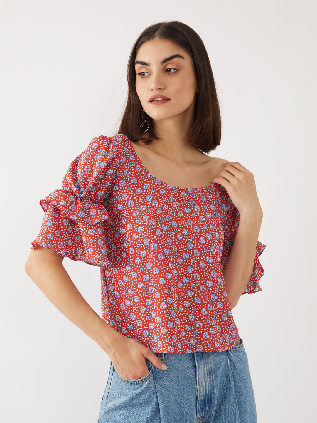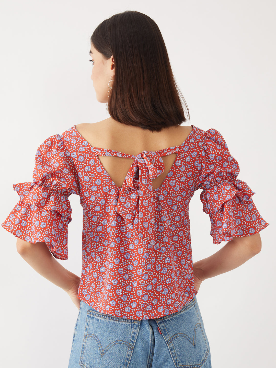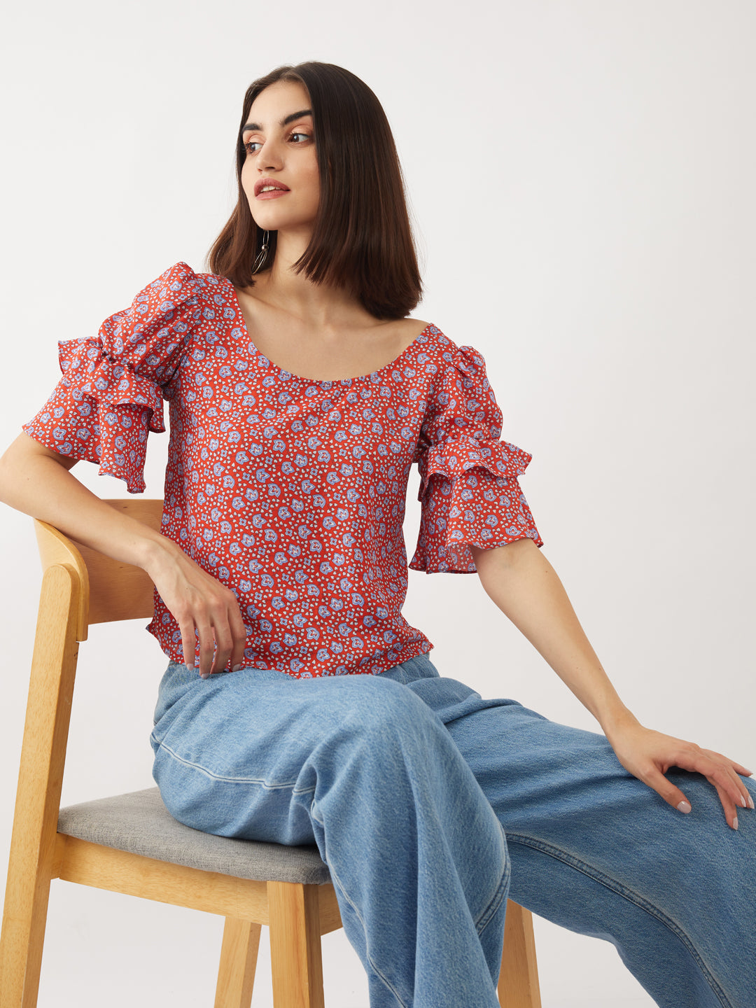 Black & Baby Pink Floral Print Ruffled Sleeves Top