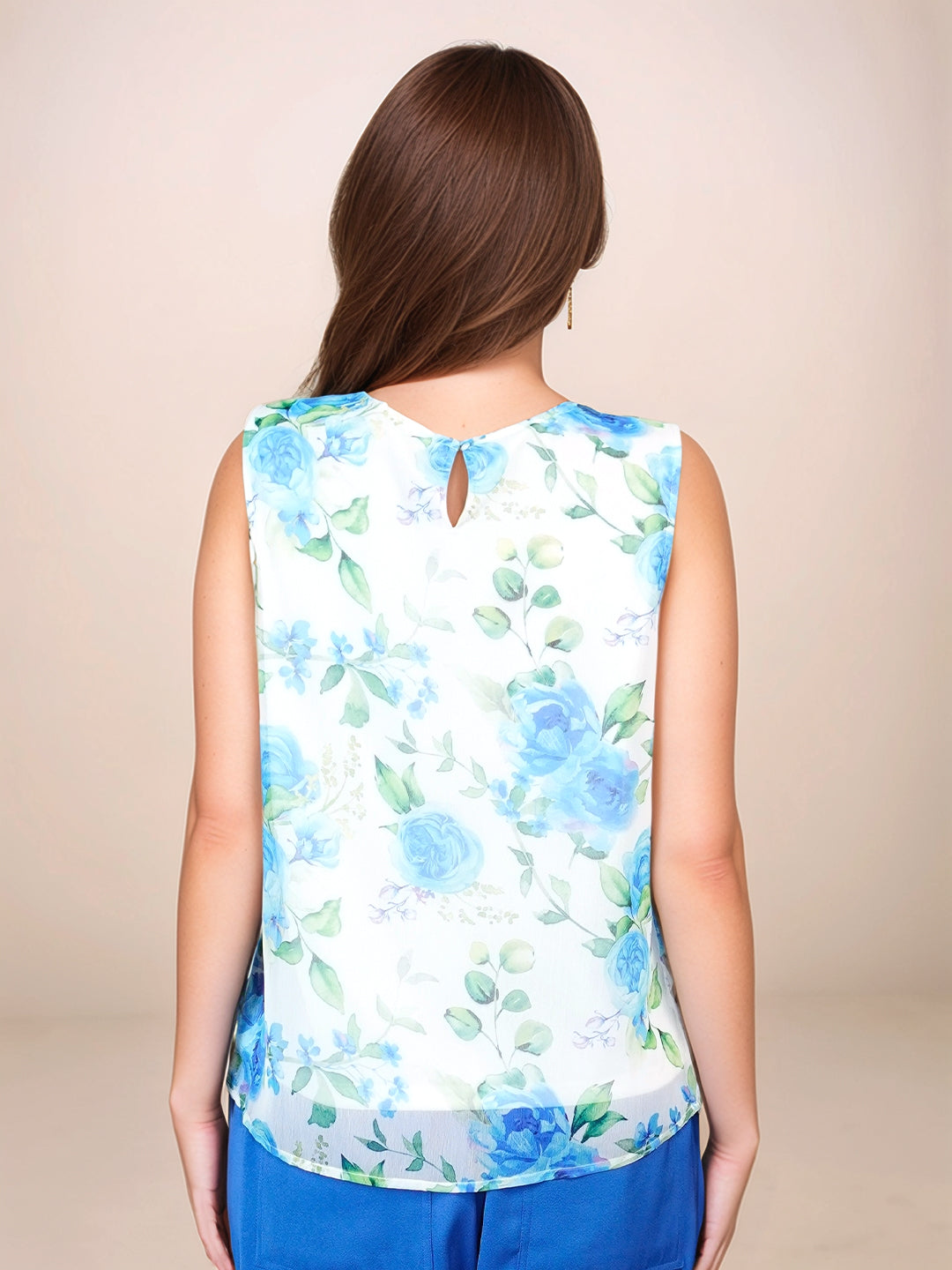 White Floral Round Neck Sleeveless Blouses & Tops