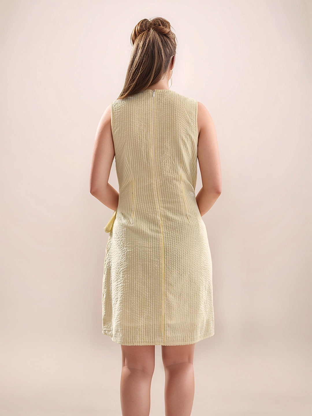 Yellow Stripes Round Neck Sleeveless V-Short Dress