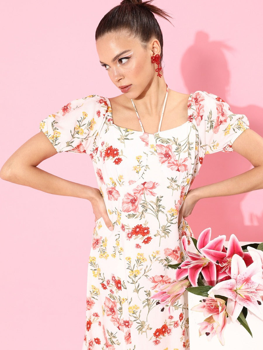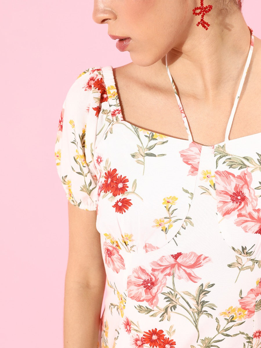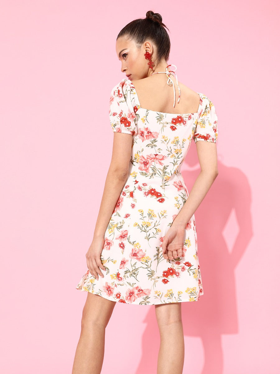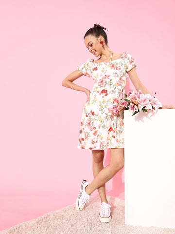 Multi-Colored Tropical Print Short Sleeves Knee-Length Dress