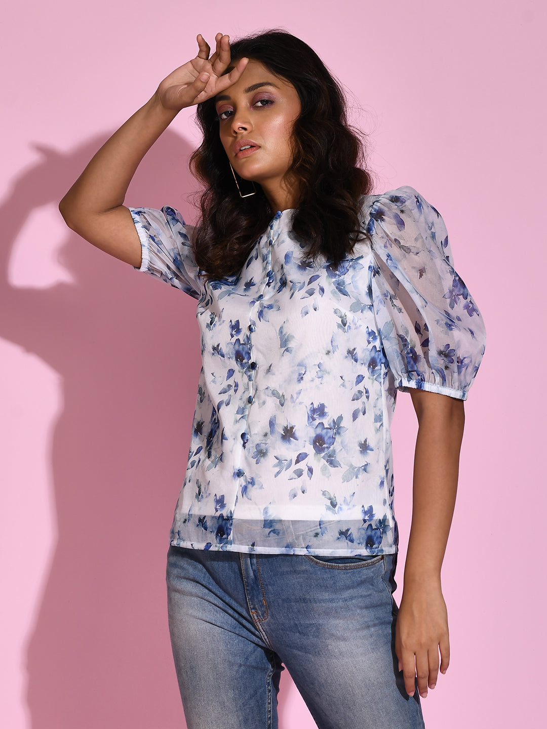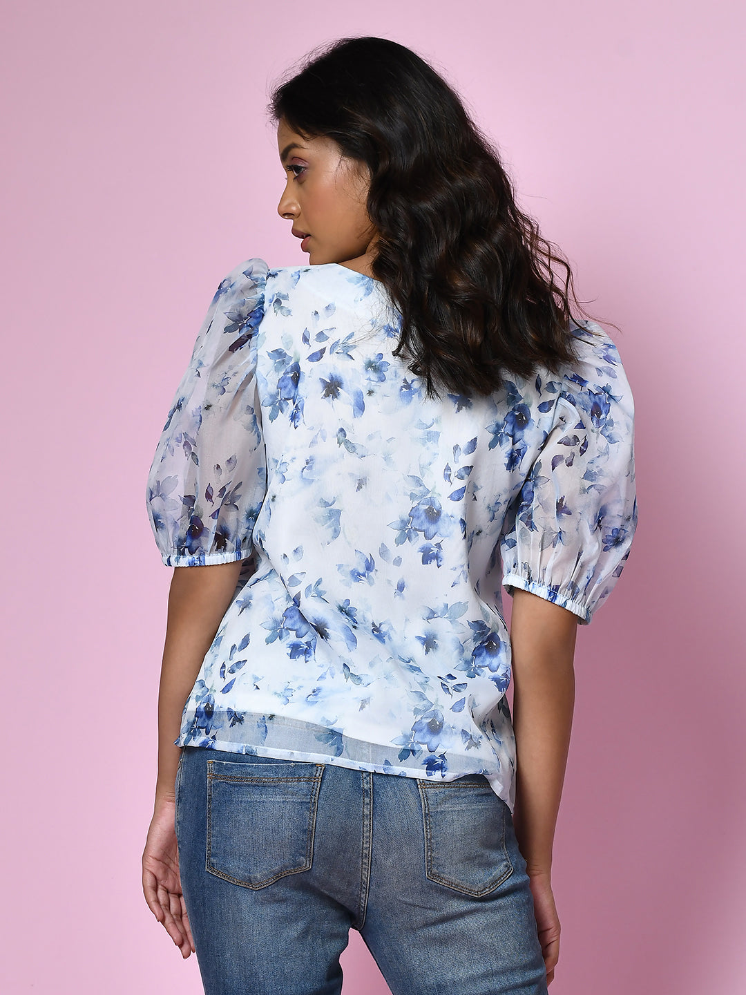 Black & Baby Pink Floral Print Ruffled Sleeves Top